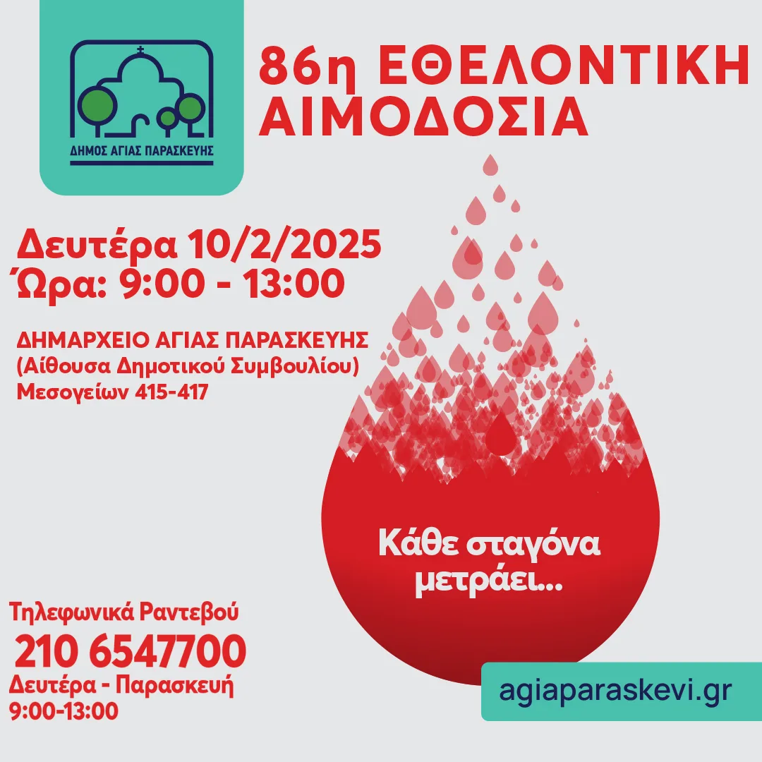 Ο Δήμος Αγίας Παρασκευής διοργανώνει την 86η Εθελοντική Αιμοδοσία με τίτλο «Δίνουμε Ζωή-Κάθε σταγόνα μετράει», που θα πραγματοποιηθεί τη Δευτέρα 10 Φεβρουαρίου από τις 09:00 έως τις 13:00, στο Δημαρχείο Αγίας Παρασκευής (Μεσογείων 415-417, Αίθουσα Δημοτικού Συμβουλίου). Καλούνται όλοι οι πολίτες να συμμετάσχουν και να προσφέρουν αίμα, παρέχοντας πολύτιμη βοήθεια σε όσους το χρειάζονται.