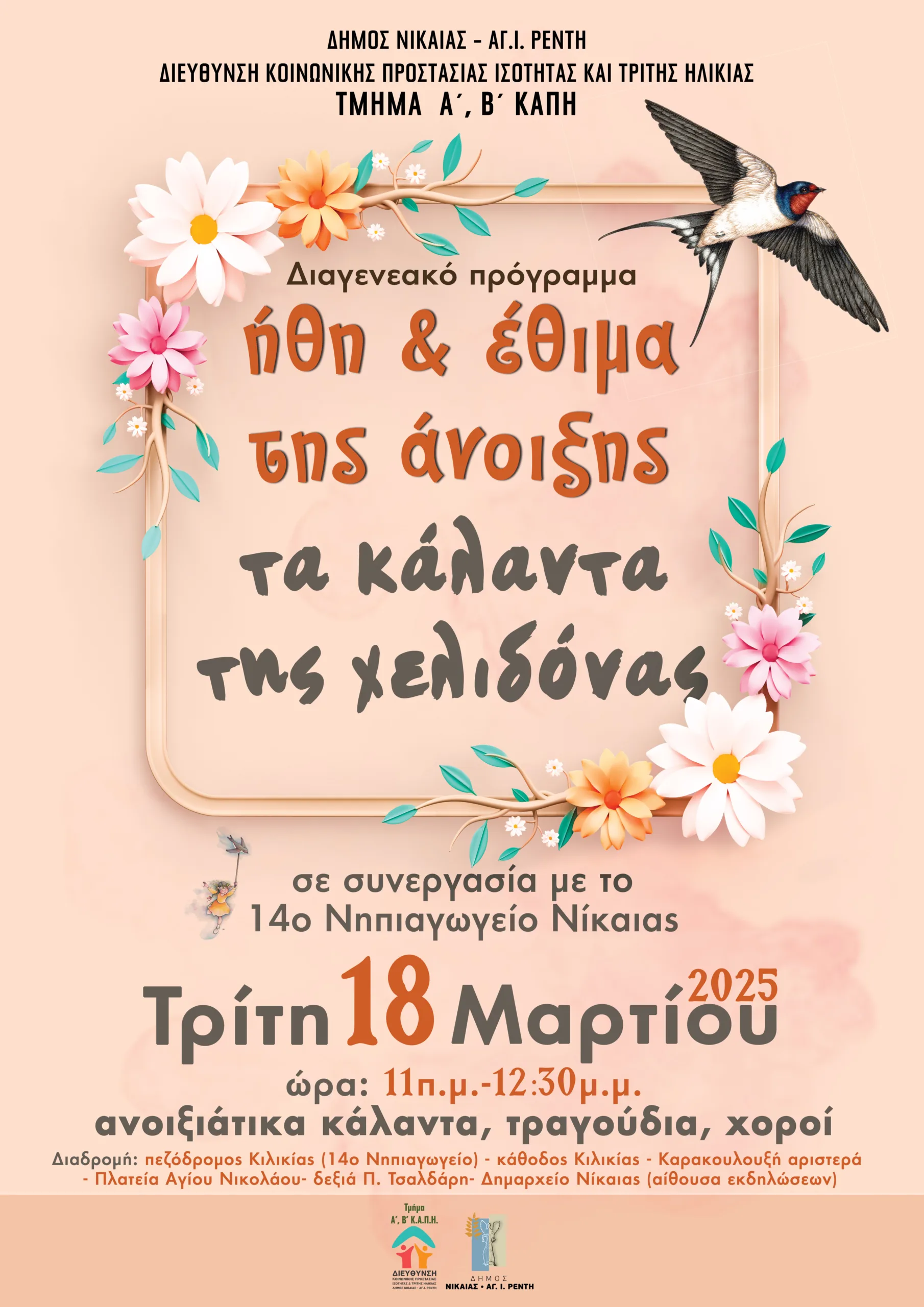 Τα Κάλαντα της Χελιδόνας, ένα παραδοσιακό έθιμο που συμβολίζει τον ερχομό της άνοιξης και την αναγέννηση της φύσης, θα αναβιώσουν την Τρίτη 18 Μαρτίου τα μέλη του Α’ και Β’ ΚΑΠΗ Νίκαιας, μαζί με τα παιδιά του 14ου Νηπιαγωγείου της πόλης.