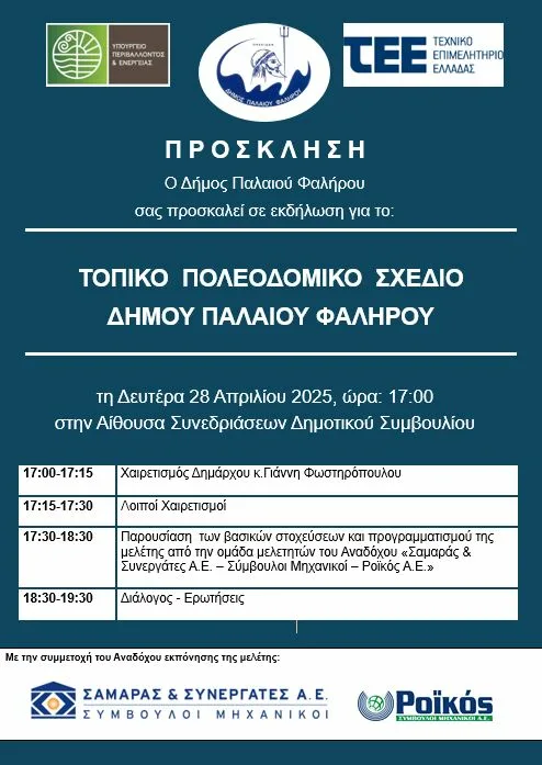 Ο Δήμος Παλαιού Φαλήρου και ο Δήμαρχος Γιάννης Φωστηρόπουλος καλούν τους δημότες σε ενημερωτική εκδήλωση που θα πραγματοποιηθεί τη Δευτέρα 28 Απριλίου 2025, στις 17:00, στην Αίθουσα Συνεδριάσεων του Δημοτικού Συμβουλίου (Τερψιχόρης 51 & Αρτέμιδος).