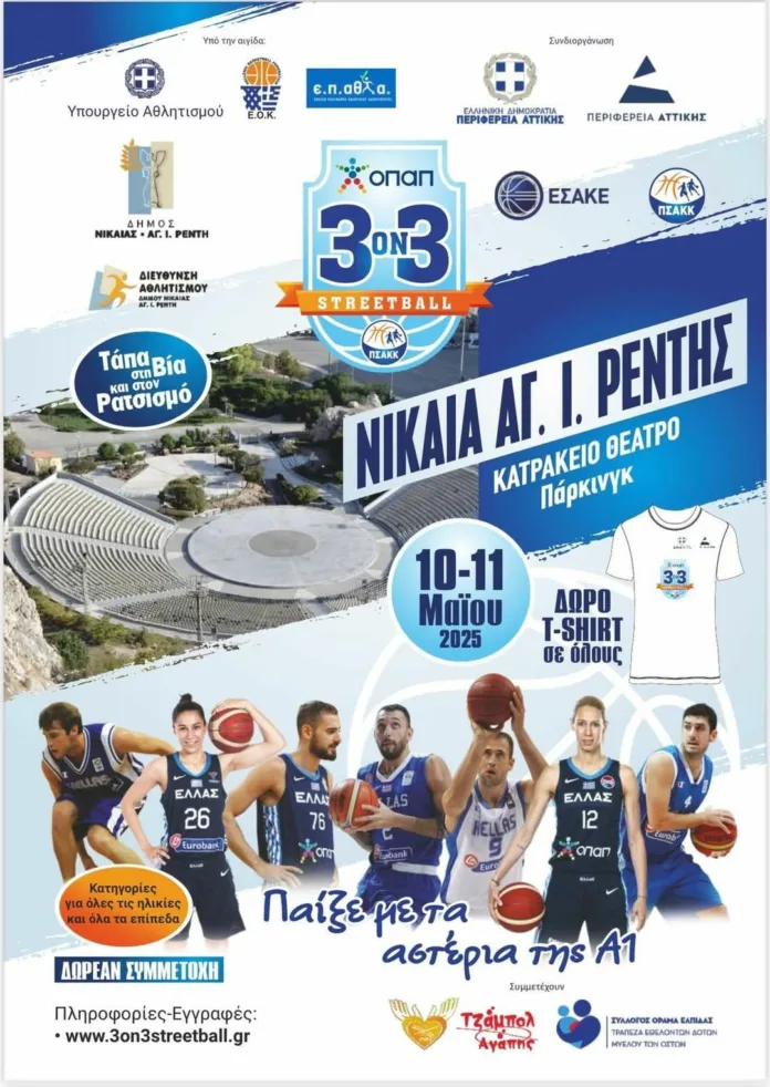 Η Νίκαια υποδέχεται στις 10 και 11 Μαΐου το τουρνουά 3on3 Streetball, μια πανελλαδική αθλητική γιορτή που συνδυάζει την αγάπη για το μπάσκετ με την προώθηση αξιών όπως ο σεβασμός και η ισότητα. Το τουρνουά πραγματοποιείται στο πάρκινγκ του Κατράκειου Θεάτρου, με την υποστήριξη του Υπουργείου Αθλητισμού, της ΕΟΚ, του ΠΣΑΚ και της Περιφέρειας Αττικής, καθώς και με τη στήριξη του Δήμου Νίκαιας-Αγ. Ι. Ρέντη.