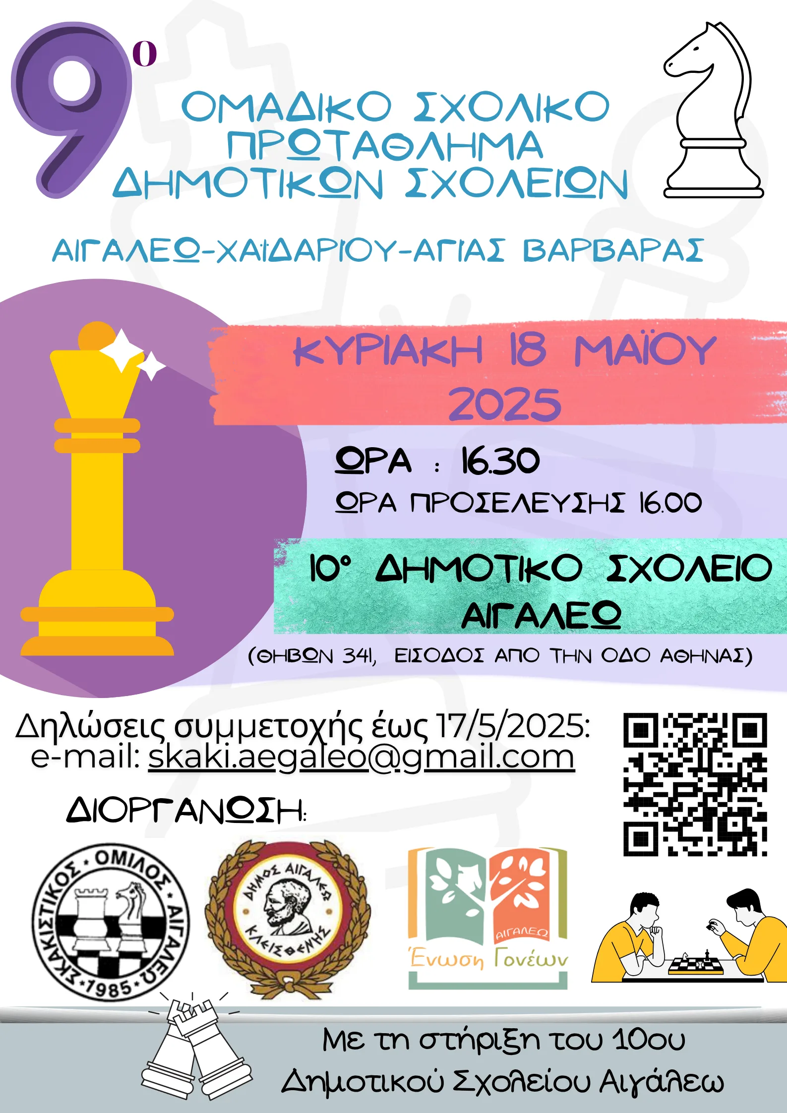 Μια ξεχωριστή σκακιστική συνάντηση για παιδιά των Δημοτικών Σχολείων έρχεται την Κυριακή 18 Μαΐου στο Αιγάλεω. Το 9ο Ομαδικό Σχολικό Πρωτάθλημα Σκάκι διοργανώνεται με τη συνεργασία του Δήμου Αιγάλεω, του Σκακιστικού Ομίλου Αιγάλεω και της Ένωσης Γονέων Αιγάλεω, με τη σημαντική συνδρομή του 10ου Δημοτικού Σχολείου Αιγάλεω.