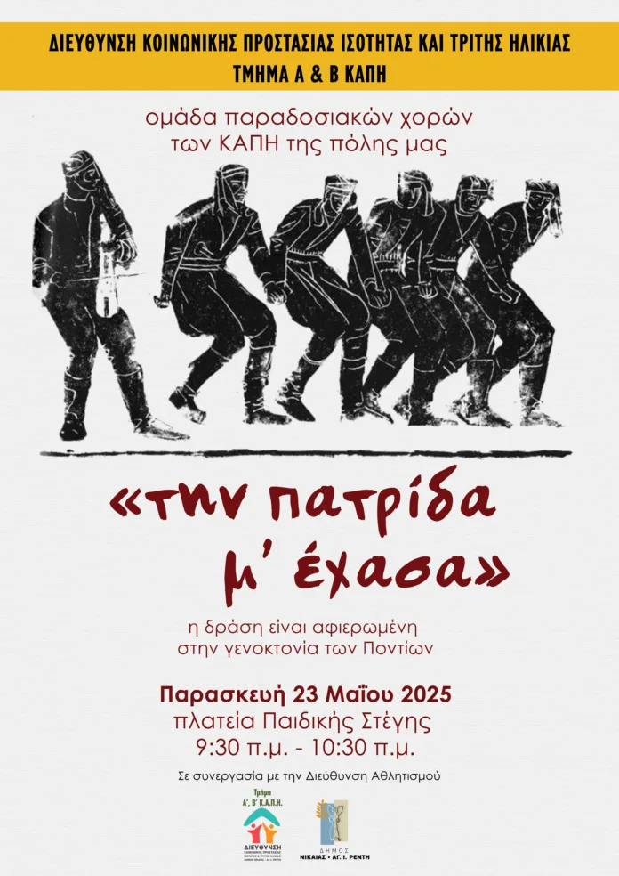 Με τίτλο «Την πατρίδα μ’ έχασα» και επίκεντρο τη μνήμη της Γενοκτονίας των Ποντίων, η ομάδα παραδοσιακών χορών των ΚΑΠΗ Δήμου Νίκαιας – Αγίου Ιωάννη Ρέντη διοργανώνει ειδική εκδήλωση την Παρασκευή 23 Μαΐου, στις 09:30 π.μ., στην Πλατεία Παιδικής Στέγης.