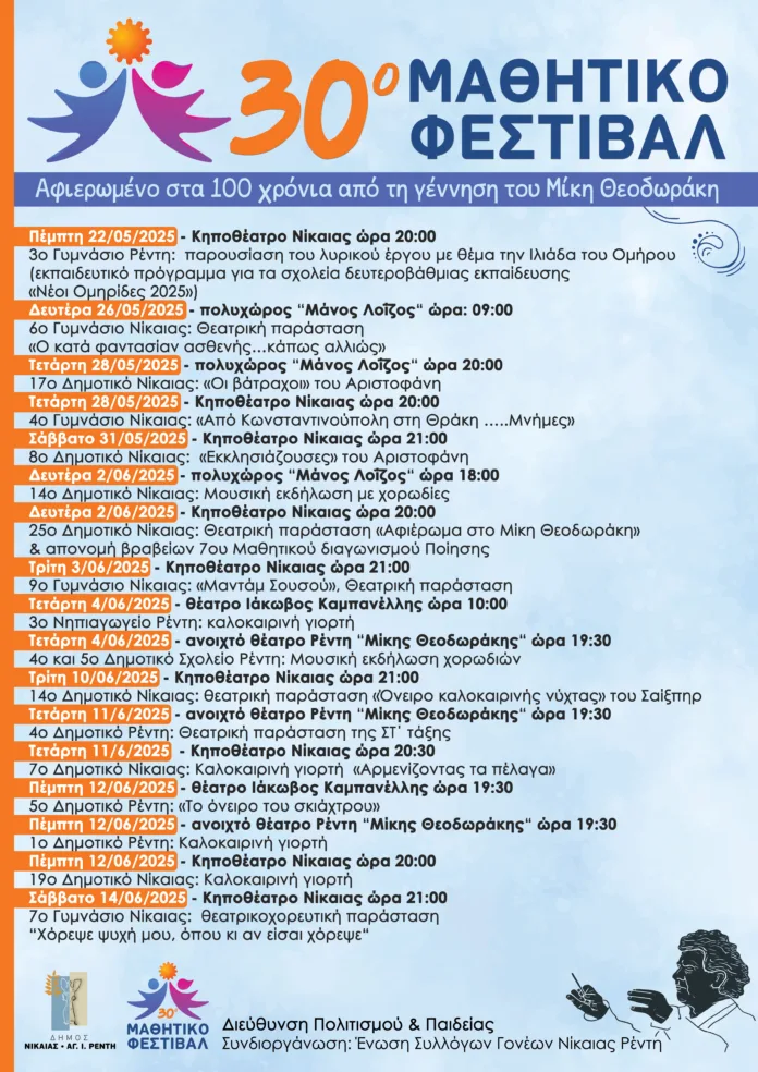 Με κέντρο τη δημιουργικότητα των παιδιών και έμπνευση από τον παγκόσμιο μουσικοσυνθέτη Μίκη Θεοδωράκη, ξεκινά το 30o Μαθητικό Φεστιβάλ του Δήμου Νίκαιας-Αγ. Ι. Ρέντη. Από τις 22 Μαΐου έως και τις 14 Ιουνίου, μαθητές και μαθήτριες των σχολείων της περιοχής δίνουν ραντεβού με την Τέχνη, την Έκφραση και τον Πολιτισμό, τιμώντας τα 100 χρόνια από τη γέννηση του μεγάλου Έλληνα δημιουργού.