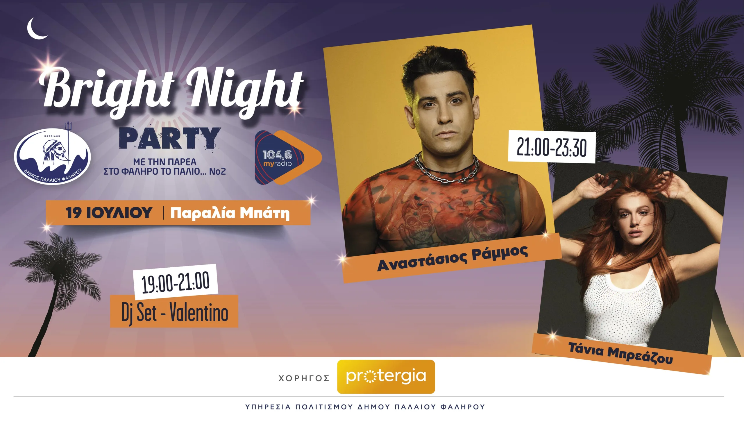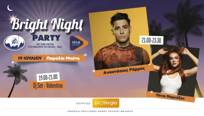 Το καλοκαίρι στο Παλαιό Φάληρο αποκτά ξανά παλμό, μουσική και ρυθμό με τη μεγάλη επιστροφή του Bright Night Party, που διοργανώνεται το Σάββατο 19 Ιουλίου στην παραλία του Μπάτη από τον Δήμο Παλαιού Φαλήρου. Μετά την επιτυχία της περσινής διοργάνωσης, το φετινό beach party υπόσχεται ακόμη πιο εντυπωσιακή εμπειρία με Αναστάσιο Ράμμο, Τάνια Μπρεάζου και τον δημοφιλή DJ Valentino στη σκηνή.