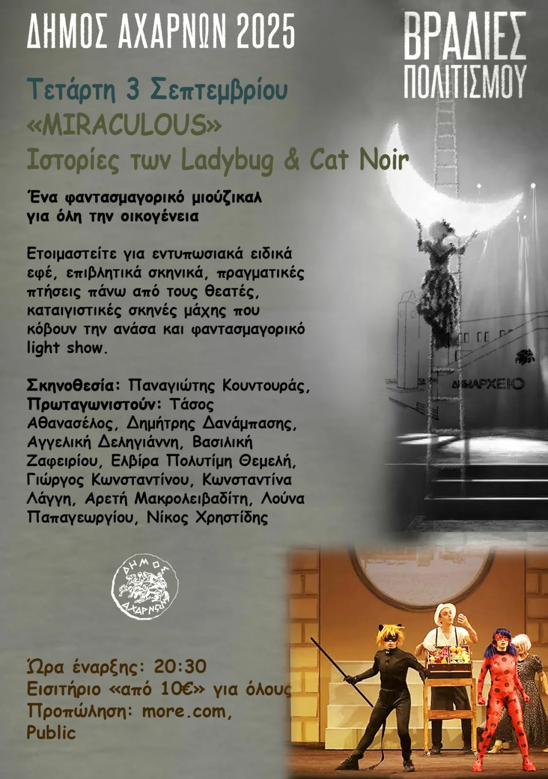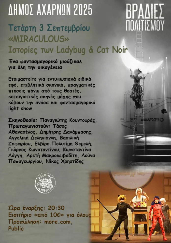 Το φαντασμαγορικό μιούζικαλ «Miraculous» Ιστορίες των Ladybug & Cat Noir ανεβαίνει σήμερα το βράδυ στο Δημοτικό Αμφιθέατρο «Μίκης Θεοδωράκης», προσφέροντας στο κοινό μια μοναδική εμπειρία στο πλαίσιο του φεστιβάλ «Βραδιές Πολιτισμού». Το κοινό θα απολαύσει εντυπωσιακά ειδικά εφέ, εντυπωσιακά σκηνικά, θεαματικές πτήσεις πάνω από τους θεατές και καταιγιστικές σκηνές μάχης.
