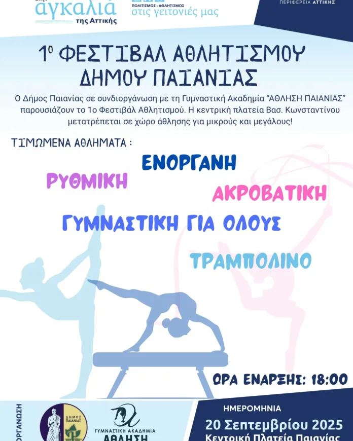 Ο Δήμος Παιανίας εγκαινιάζει τον θεσμό των Φεστιβάλ Αθλητισμού στο πλαίσιο του προγράμματος της Περιφέρειας Αττικής «Στην Αγκαλιά της Αττικής – Πολιτισμός Αθλητισμός». Στόχος είναι να γνωρίσουν οι μικροί δημότες τα πιο δημοφιλή αθλήματα μέσα από βιωματικές δράσεις. Η αρχή γίνεται με τη ρυθμική, ακροβατική και ενόργανη γυμναστική, σε συνδιοργάνωση με τον Αθλητικό Σύλλογο «Άθληση Παιανίας».
