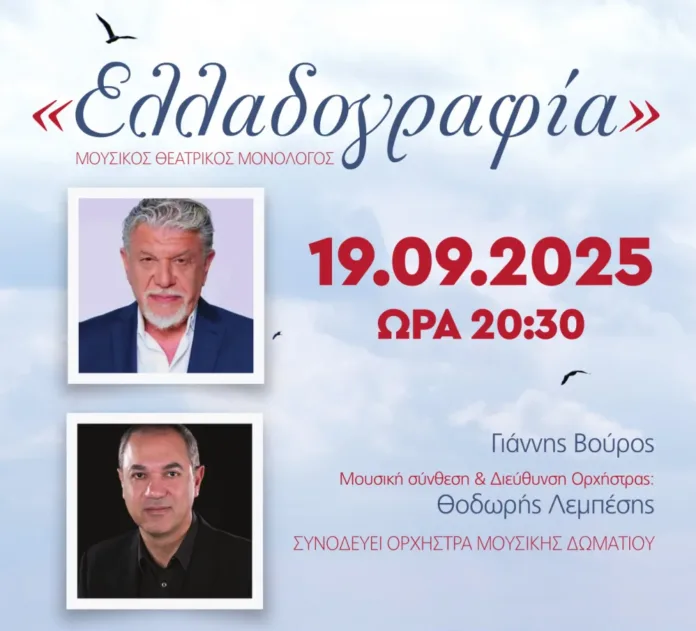 Ο Δήμος Βάρης Βούλας Βουλιαγμένης προσκαλεί το κοινό την Παρασκευή 19 Σεπτεμβρίου, στις 20:30, στο Θέατρο Βέμπο (Παραλία Βούλας), για να παρακολουθήσει τον μουσικό-θεατρικό μονόλογο «Ελλαδογραφία», ένα έργο αφιερωμένο στη μακραίωνη πορεία του ελληνισμού.