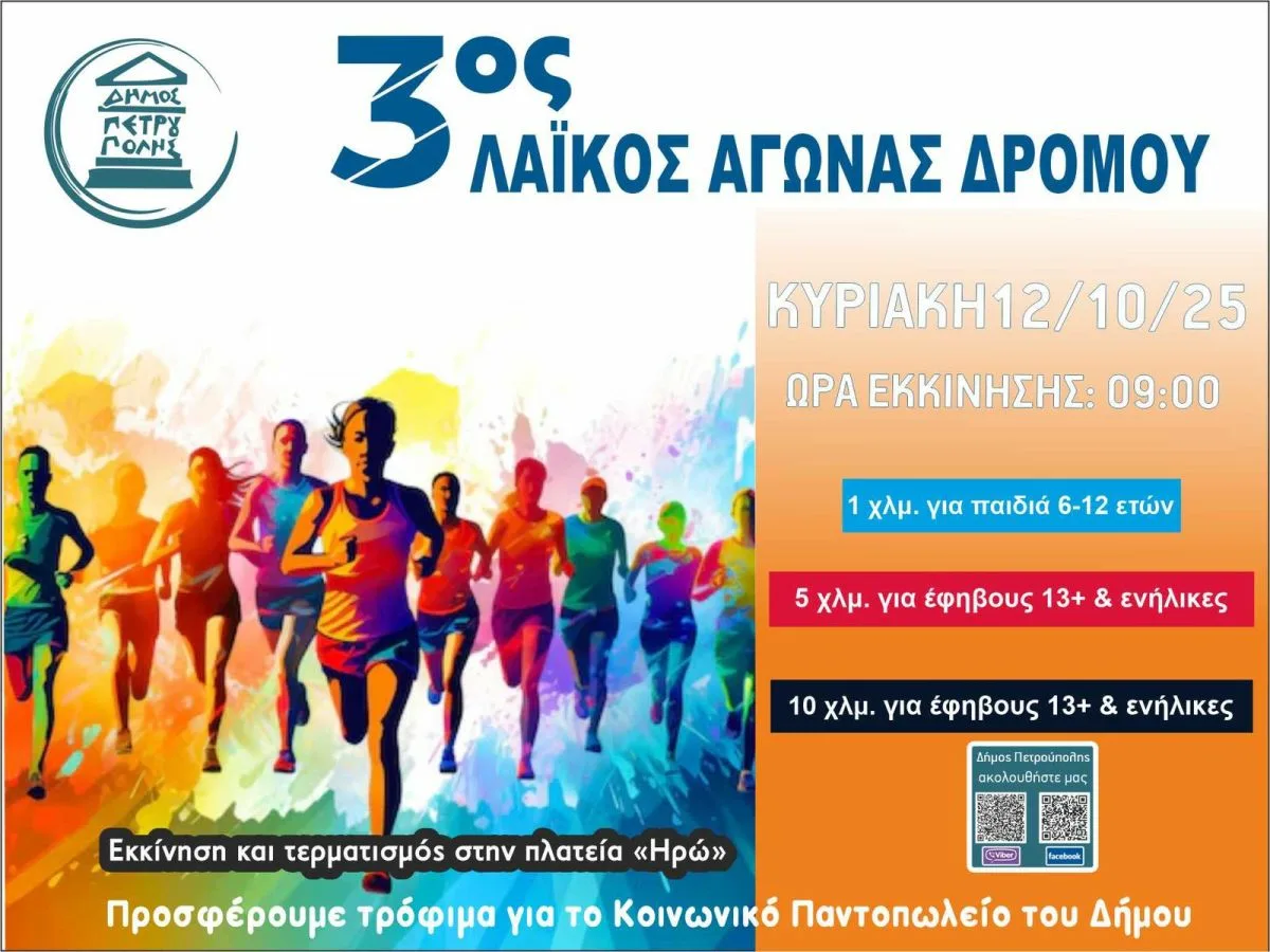 Ο Δήμος Πετρούπολης διοργανώνει την Κυριακή 12 Οκτωβρίου 2025 τον 3ο «Λαϊκό Αγώνα Δρόμου», μια αθλητική γιορτή για μικρούς και μεγάλους με στόχο τη χαρά της άσκησης και την ενίσχυση της σωματικής και ψυχικής υγείας. Η συμμετοχή είναι δωρεάν, με τον Δήμο να προτρέπει τους δρομείς να προσφέρουν τρόφιμα μακράς διάρκειας για το Κοινωνικό Παντοπωλείο.