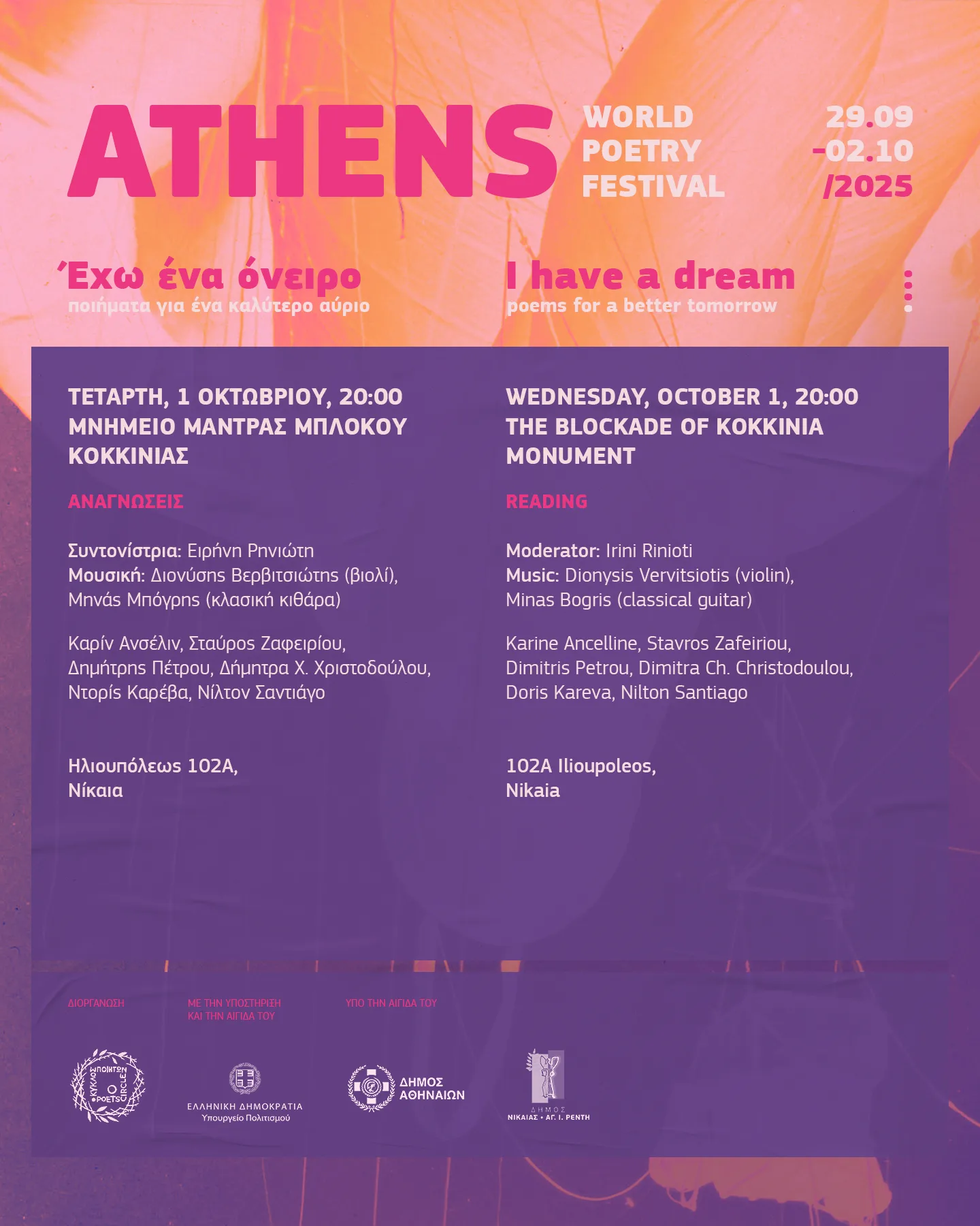Ποιητές από την Ελλάδα και το εξωτερικό, όπως οι Καρίν Ανσέλιν, Σταύρος Ζαφειρίου, Δημήτρης Πέτρου, Δήμητρα Χ. Χριστοδούλου, Ντορίς Καρέβα και Νίλτον Σαντιάγο, θα δώσουν το παρών με απαγγελίες και δημιουργίες. Τη βραδιά θα εμπλουτίσουν μουσικά οι Διονύσης Βερβιτσιώτης στο βιολί και ο Μηνάς Μπόγρης στην κλασική κιθάρα, υπό τον συντονισμό της Ειρήνης Ρηνιώτη.