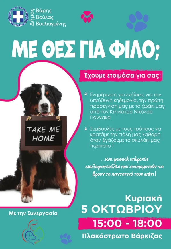Ο Δήμος Βάρης Βούλας Βουλιαγμένης, μέσω του Τμήματος Διαχείρισης Αδέσποτων Ζώων, διοργανώνει την Κυριακή 5 Οκτωβρίου 2025, από τις 15:00 έως τις 18:00 στο Πλακόστρωτο της Βάρκιζας, μια ξεχωριστή γιορτή δημιουργικής ενημέρωσης και υιοθεσίας με τίτλο «Με θέλεις για φίλο».