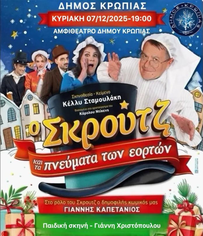 Την Κυριακή 7 Δεκεμβρίου, στο αμφιθέατρο του Δημαρχείου, στις 19:00 θα παρουσιαστεί η παιδική θεατρική παράσταση «Ο Σκρουτζ και τα Πνεύματα των Εορτών» με τον Γιάννη Καπετάνιο, βασισμένη στο έργο του Κάρολου Ντίκενς.