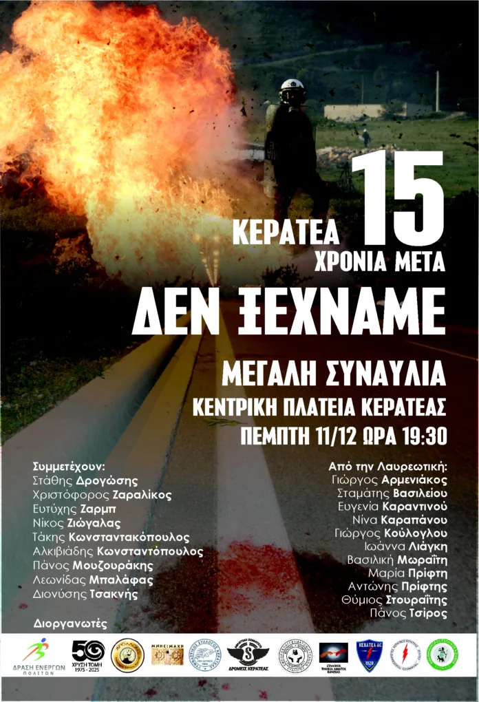 Με αυτό το ιστορικό ορόσημο ως αφορμή, στις 11 Δεκεμβρίου στις 19:30 διοργανώνεται μεγάλη συναυλία στην κεντρική πλατεία Κερατέας, με τη συμμετοχή καλλιτεχνών που είχαν συμπαρασταθεί στον αγώνα και πολλών τοπικών δημιουργών. Στη σκηνή θα ανέβουν οι Στάθης Δρογώσης, Χριστόφορος Ζαραλίκος, Ευτύχης Ζαρμπ, Νίκος Ζιώγαλας, Αλκιβιάδης Κωνσταντόπουλος, Τάκης Κωνσταντακόπουλος, Πάνος Μουζουράκης, Λεωνίδας Μπαλάφας και Διονύσης Τσακνής. Από τη Λαυρεωτική συμμετέχουν οι Γιώργος Αρμενιάκος, Σταμάτης Βασιλείου, Ευγενία Καραντινού, Νίνα Καραπάνου, Γιώργος Κούλογλου, Ιωάννα Λιάγκη, Βασιλική Μωραΐτη, Μαρία Πρίφτη, Αντώνης Πρίφτης, Θύμιος Στουραΐτης και Πάνος Τσίρος.