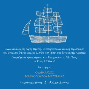 ΑρχικήΧωρίς κατηγορίαΔήμος Μαρκοπούλου ΜεσογαίαςΕορταστικές ευχές από τον Δήμαρχο Μαρκοπούλου Μεσογαίας Δήμος Μαρκοπούλου ΜεσογαίαςΠολιτισμός Εορταστικές ευχές από τον Δήμαρχο Μαρκοπούλου Μεσογαίας By kwnstantinos 18 Δεκεμβρίου 2025 0 5 μερίδιο FacebookTwitterPinterestWhatsApp Μήνυμα για Χριστούγεννα και νέο έτος από τον Κωνσταντίνο Δ. Αλλαγιάννη Tags#ΠρωτοχρονιάΔήμαρχος Μαρκοπούλουεορταστικές ευχέςΚωνσταντίνος ΑλλαγιάννηςΜΑΡΚΟΠΟΥΛΟ ΜΕΣΟΓΑΙΑΣχριστουγεννα μερίδιο FacebookTwitterPinterestWhatsApp Προηγούμενο άρθροΧριστούγεννα με τον Σύλλογο Φιλομούσων ΛαυρίουΕπόμενο άρθροΔιανομή τροφίμων και ειδών φαρμακείου στις κοινωνικές δομές kwnstantinoshttp://ifn.gr RELATED ARTICLES Πολιτισμός Χριστούγεννα προσφοράς από τη ΔΕΗ με τη δράση «Ένα με τα Παιδιά» 19 Δεκεμβρίου 2025 Δήμος Σαρωνικού Τα μεγάλα εγκαίνια του «Χωριού των Θαυμάτων» στη Σαρωνίδα 18 Δεκεμβρίου 2025 Δήμος Λαυρεωτικής Χριστούγεννα με τον Σύλλογο Φιλομούσων Λαυρίου 18 Δεκεμβρίου 2025 ΑΦΗΣΤΕ ΜΙΑ ΑΠΑΝΤΗΣΗ Ακύρωση απάντησης Σχόλιο: εισάγετε το σχόλιό σας! Όνομα:* παρακαλώ εισάγετε το όνομά σας εδώ Email:* έχετε εισάγει εσφαλμένη διεύθυνση ηλεκτρονικού ταχυδρομείου! παρακαλώ εισάγετε εδώ την ηλεκτρονική σας διεύθυνση Ιστοσελίδα: αποθηκεύστε το όνομα, το ηλεκτρονικό ταχυδρομείο και τον ιστότοπό μου σε αυτό το πρόγραμμα περιήγησης για την επόμενη φορά που θα σχολιάσω. - Advertisment - Most Popular ΔΕΗ: «Quiet Hour» στα καταστήματα για μια πιο συμπεριληπτική εμπειρία 19 Δεκεμβρίου 2025 Χριστούγεννα προσφοράς από τη ΔΕΗ με τη δράση «Ένα με τα Παιδιά» 19 Δεκεμβρίου 2025 PPC blue RFID κάρτα: Φόρτιση ηλεκτρικών οχημάτων χωρίς κινητό 19 Δεκεμβρίου 2025 Όμιλος ΔΕΗ: Νέα ορόσημα βιωσιμότητας και ενισχυμένη διαφάνεια 19 Δεκεμβρίου 2025 Φόρτωση περισσοτέρων Recent Comments