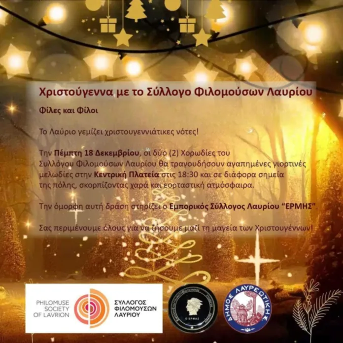 Χριστουγεννιάτικο χρώμα και μουσική ζωντάνια αποκτά το Λαύριο την Πέμπτη 18 Δεκεμβρίου, μέσα από μια ξεχωριστή δράση του Συλλόγου Φιλομούσων Λαυρίου. Οι δύο Χορωδίες του Συλλόγου δίνουν ραντεβού με το κοινό και μεταφέρουν το εορταστικό κλίμα στους δρόμους της πόλης, τραγουδώντας αγαπημένες γιορτινές μελωδίες.