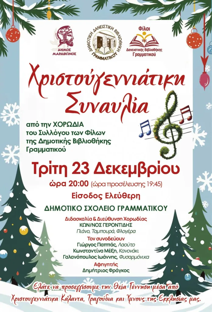 Η χορωδία του Σύλλογος Φίλων Δημοτικής Δανειστικής Βιβλιοθήκης Γραμματικού προσκαλεί το κοινό σε χριστουγεννιάτικη συναυλία που θα πραγματοποιηθεί την Τρίτη 23 Δεκεμβρίου 2025, στις 8 το βράδυ, στο Δημοτικό Σχολείο Γραμματικού. Η εκδήλωση εντάσσεται στο πλαίσιο των εορταστικών δράσεων της περιοχής και φιλοδοξεί να προσφέρει μια ζεστή μουσική εμπειρία σε κατοίκους και επισκέπτες.