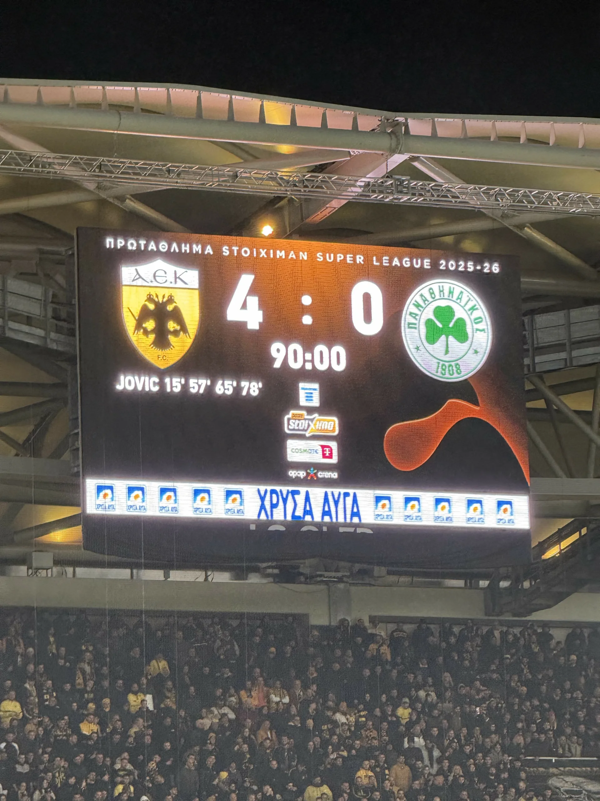 Μια από τις πιο επιβλητικές εμφανίσεις της σε ντέρμπι πραγματοποίησε η ΑΕΚ, η οποία επικράτησε με 4-0 του Παναθηναϊκού στην OPAP Arena, έχοντας σε εκπληκτική βραδιά τον Λούκα Γιόβιτς. Ο Σέρβος φορ ήταν ασταμάτητος, σκοράροντας τέσσερις φορές και μετατρέποντας το μεγάλο παιχνίδι σε προσωπική του υπόθεση.