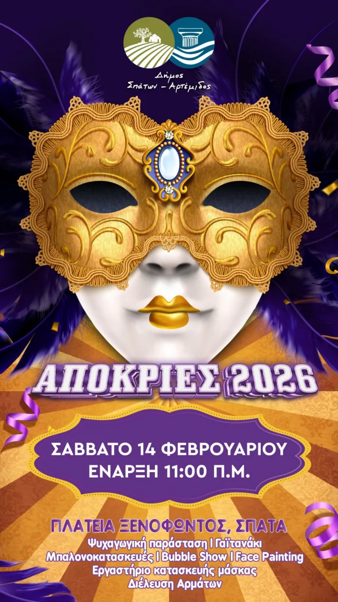 Με ένα πλούσιο διήμερο εκδηλώσεων, ο Δήμος Σπάτων – Αρτέμιδος προσκαλεί κατοίκους και επισκέπτες να γιορτάσουν τις Απόκριες 2026 σε κλίμα χαράς, δημιουργίας και συλλογικής διασκέδασης.