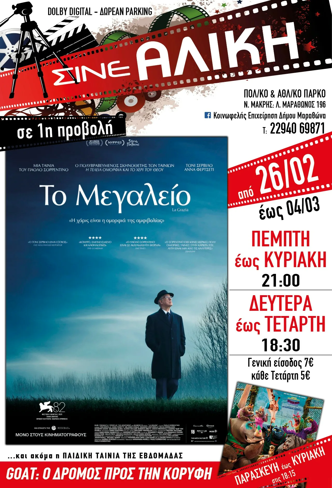 Το κινηματογραφικό πρόγραμμα στο ΣΙΝΕ ΑΛΙΚΗ ανανεώνεται με ταινίες πρώτης προβολής. Από την Πέμπτη 26 Φεβρουαρίου ξεκινούν οι προβολές για τους μεγάλους, ενώ από την Παρασκευή 27 Φεβρουαρίου 2026 προγραμματίζονται και οι παιδικές προβολές.