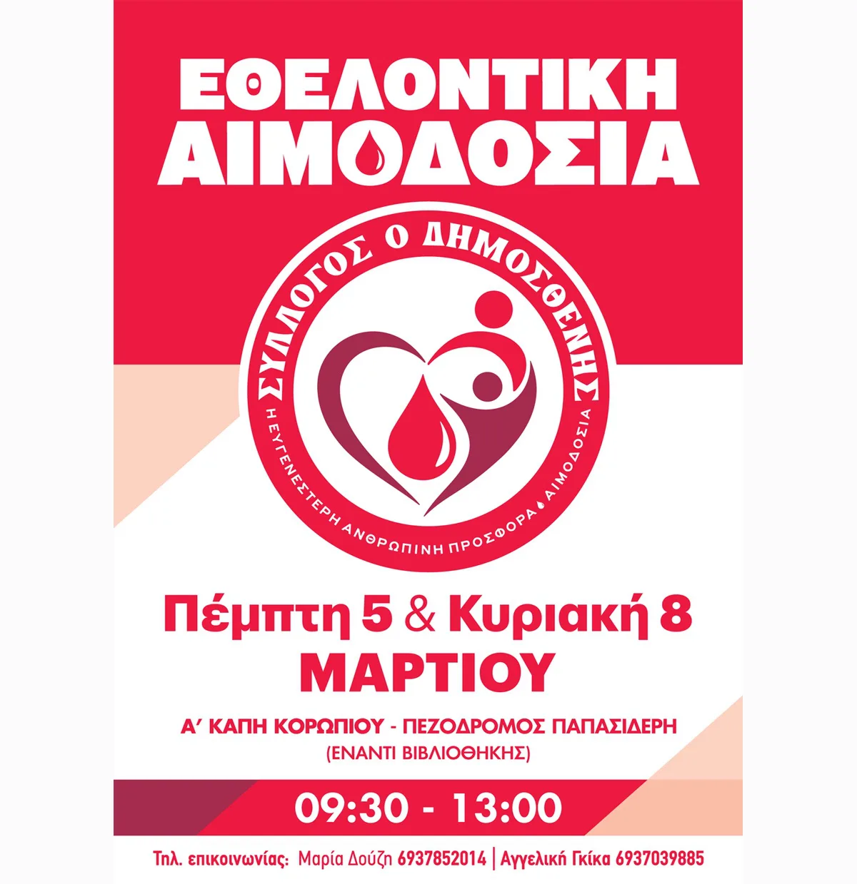Διήμερη εθελοντική αιμοδοσία διοργανώνεται στην πόλη του Κορωπί, στο Α’ ΚΑΠΗ, με στόχο την ενίσχυση της Τράπεζας Αίματος και τη στήριξη συνανθρώπων που έχουν ανάγκη. Η δράση θα πραγματοποιηθεί την Πέμπτη 5 και την Κυριακή 8 Μαρτίου 2026, από τις 09:30 έως τις 13:00, στον πεζόδρομο Ολυμπιονίκη Γ.Σ. Παπασιδέρη.