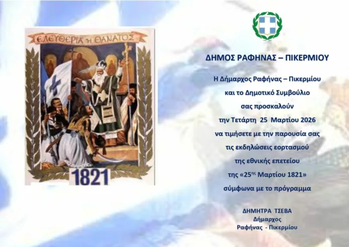 Η Δήμαρχος Ραφήνας – Πικερμίου Δήμητρα Τσεβά και το Δημοτικό Συμβούλιο απευθύνουν ανοιχτή πρόσκληση προς τους πολίτες να παραστούν στις εκδηλώσεις για τον εορτασμό της Εθνικής Επετείου της 25ης Μαρτίου 1821.