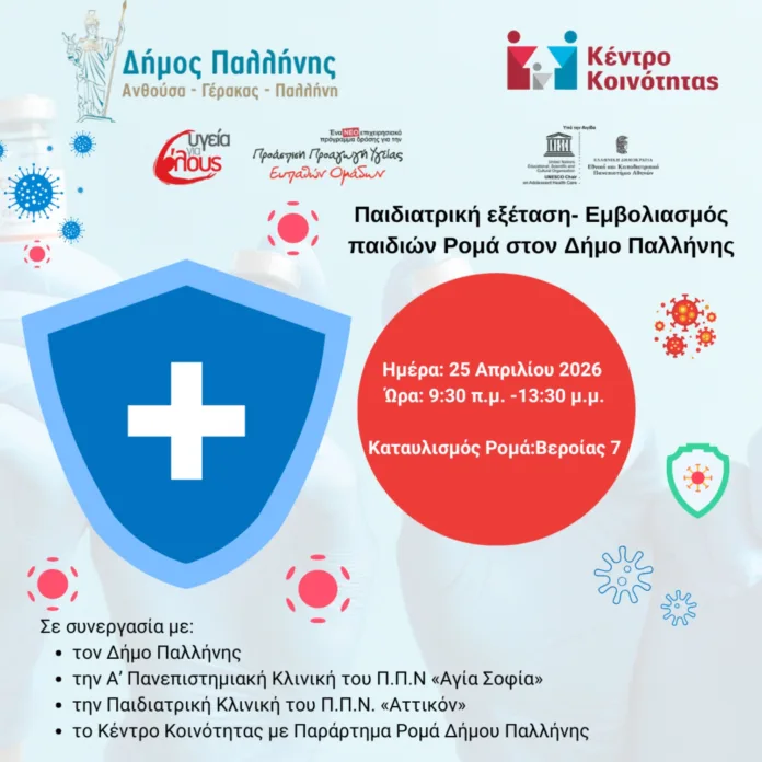 Στο πλαίσιο της ενίσχυσης της πρωτοβάθμιας φροντίδας υγείας, ο Δήμος Παλλήνης προχωρά σε στοχευμένη δράση εμβολιασμού και παιδιατρικής εξέτασης για παιδιά ωφελούμενων του Κέντρου Κοινότητας με Παράρτημα Ρομά. Η πρωτοβουλία απευθύνεται σε παιδιά ηλικίας από 30 μηνών έως 15 ετών και εντάσσεται στο πλαίσιο του Εθνικού Προγράμματος Εμβολιασμών.