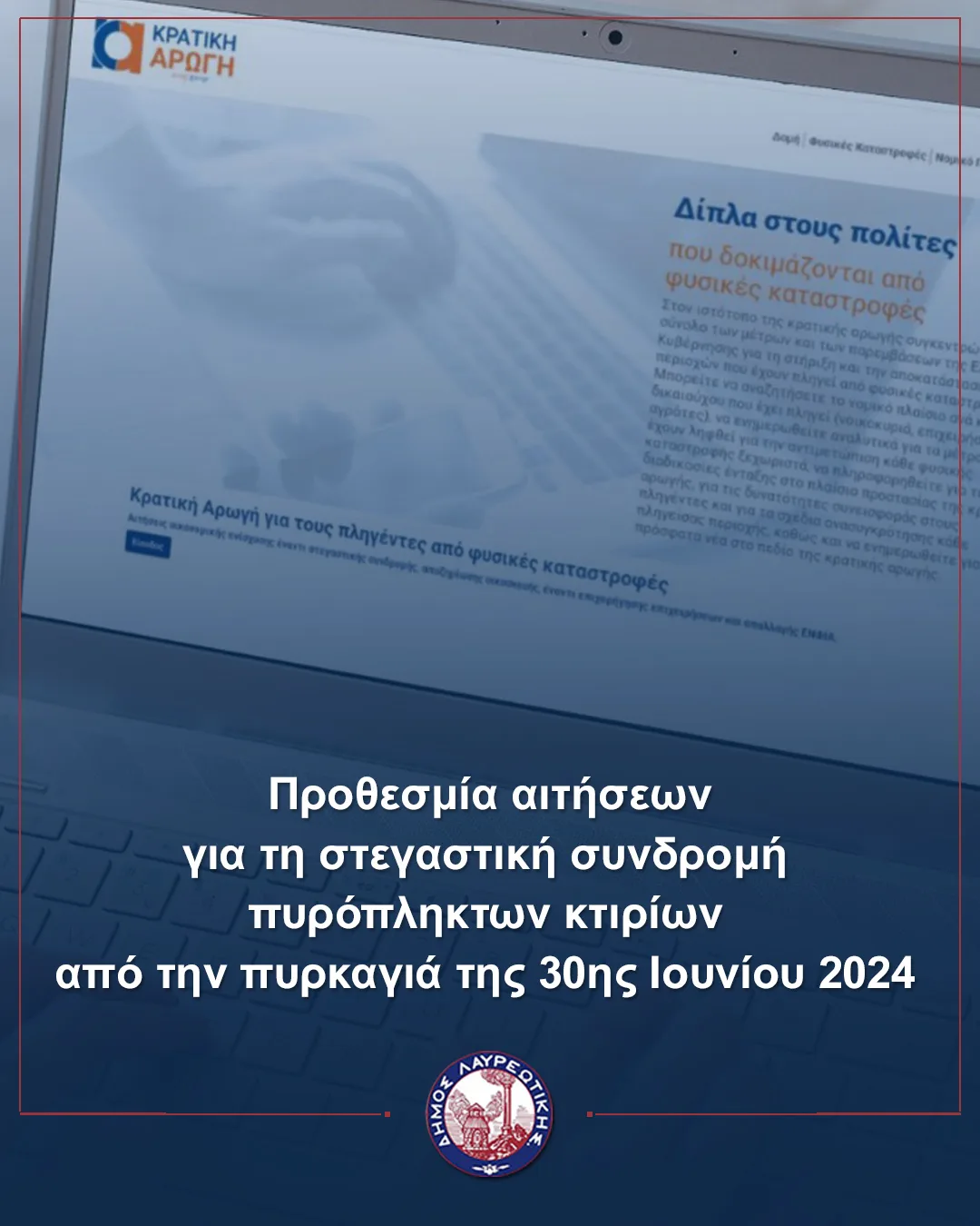 Ο Δήμος Λαυρεωτικής ενημερώνει ότι δημοσιεύθηκε σε ΦΕΚ η απόφαση του Υπουργείο Κλιματικής Κρίσης και Πολιτικής Προστασίας σχετικά με τις προθεσμίες χορήγησης στεγαστικής συνδρομής για τα κτίρια που υπέστησαν ζημιές από την πυρκαγιά της 30ής Ιουνίου 2024.